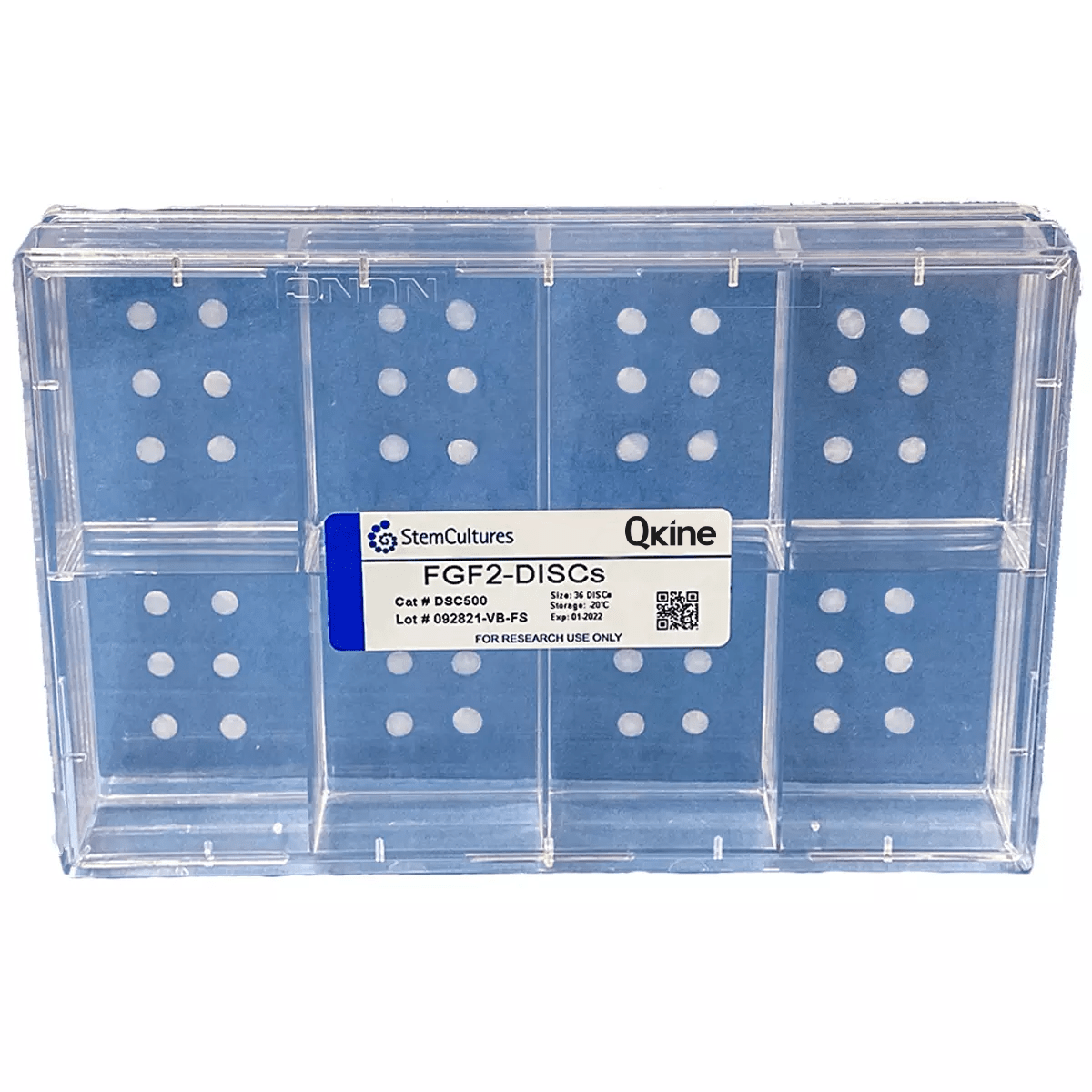 Qkine FGF2 DISCs are biocompatible hydrogels that release defined levels of Qkine recombinant human FGF2 154 aa (Qk027, Highly pure and bioactive 17 kDa FGF-2 / bFGF protein, animal origin-free (AOF) and carrier protein-free (CF)) stably into culture medium over the course of one week. Native FGF2 (154 aa) has a short half life (4 hours) and rapidly decays in cell culture media. Adding soluble FGF2 through daily, conventional commercial media feeds creates fluctuations in growth factor levels that affect signaling pathways and creates a stressful cellular environment. With FGF2 DISCs, FGF2 levels are stable over one week, allowing the following: