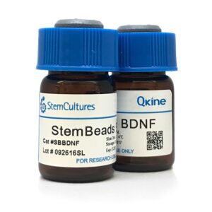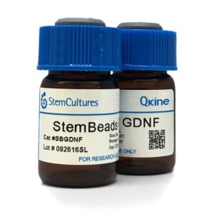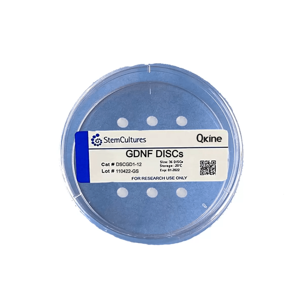 Qkine GDNF DISCs are patented inert, non-degradable, biocompatible hydrogels that release defined levels of Qkine human recombinant GDNF (Qk051) stably into culture medium over the course of two weeks. Qkine GDNF DISCs are loaded with StemBeads® Qkine GDNF (Qk-SBGD1), PLGA microbeads that encapsulate the protein. GDNF is key for supporting neuronal differentiation. Qkine GDNF DISCs are easy to add and remove, giving scientists enhanced control of growth factor levels in their cultures. Controlled delivery and stable levels overcome the 45-minute half-life of GDNF and improve cell cultures while saving researchers valuable time and resources, allowing the following: