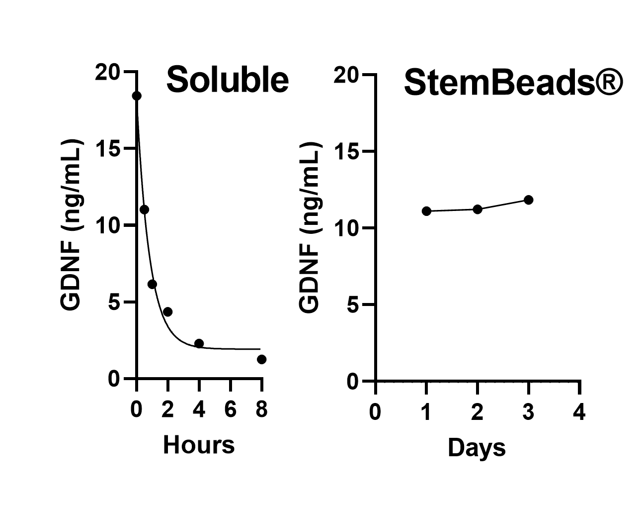 StemBeads® GDNF is a patented growth factor supplement that offers a novel way to culture cells with native Glial Derived Neurotrophic Factor more efficiently, with greater control and fewer medium changes. GDNF is key for supporting neural progenitor cells (NPCs) and neuronal differentiation. StemBeads® GDNF are microbeads composed of an FDA approved, biodegradable PLGA polymer that is loaded with native, non-mutant recombinant human GDNF and release the encapsulated protein at a constant rate. Controlled delivery and stable levels overcome the 45-minute half-life (Figure above) of GDNF and improve cell cultures while saving researchers valuable time and resources.